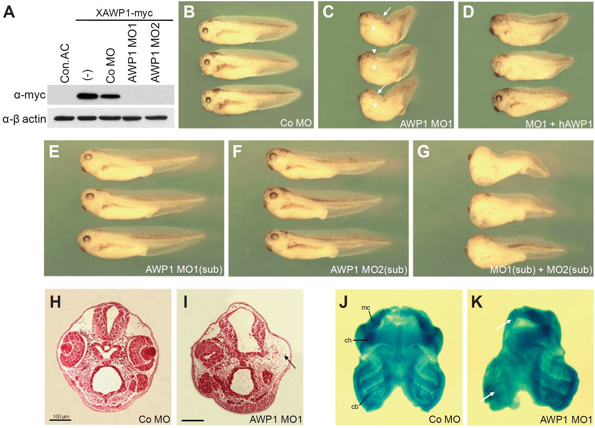 Fig. 2. A knockdown of XAWP1 disrupts neural crest derivatives. (A) Western blotting analysis of the specificity and efficiency of MOs. Four-cell stage embryos were injected in the animal pole region with XAWP1-Myc (200 pg) alone or with Co MO (30 ng), AWP1 MO1 (20 ng) or AWP1 MO2 (30 ng) and animal cap explants were then dissected at stage 9 and cultured to stage 11 for western blotting with an anti-myc antibody. ô -actin was used as a loading control. (B-G) Embryos were injected in the dorso-animal region of two blastomeres at the 8-cell stage with Co MO (10 ng), AWP1 MO1 (10 ng for C and D, 5 ng for E and G), AWP1 MO2 (30 ng) and hAWP1 (5 pg) as indicated and cultured to stage 38. Arrows and arrowheads indicate defects in the dorsal fin and pigmentation, respectively. sub, suboptimal. (H,I) Fourcell stage embryos were injected in the dorso-animal region of one blastomere with AWP1 MO1 (5 ng) or Co MO (10 ng) and then subjected to paraffin sectioning and eosin staining at stage 40. An arrow indicates the defective eye in the injected side. (J,K) One blastomere of a four-cell stage embryo was injected in the dorso-animal region with AWP1 MO1 (5 ng) or Co MO (10 ng) and then stained with alcian blue at stage 45. Arrows indicate severely disrupted ceratobranchial and Meckelâs cartilage in the injected side. cb, ceratobranchial cartilage; mc, Meckelâs cartilage; ch, ceratohyalcartilage.
