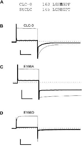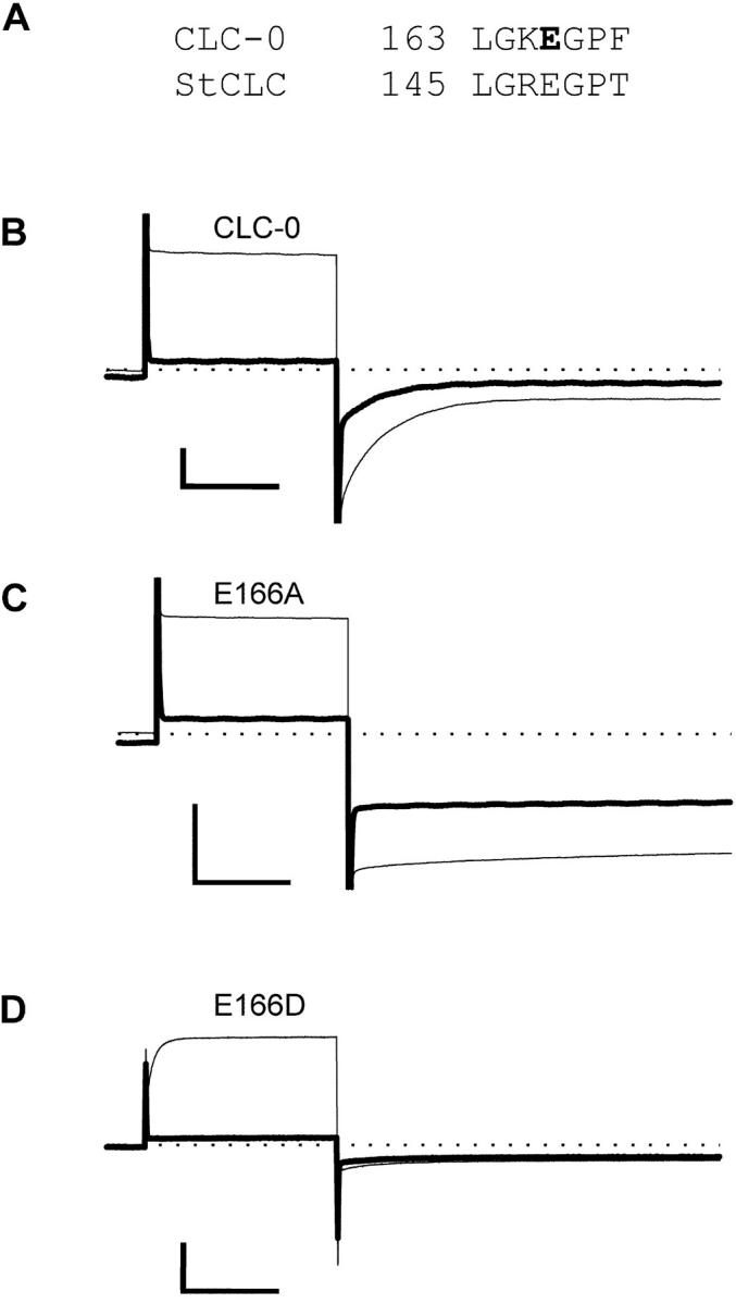 Figure 1. . Phenotype of mutations. Glutamate 148 of the StCLC channel (Dutzler et al., 2002) marks the beginning of helix F and is part of a highly conserved structural motif of CLC channels. The phenotype of mutations E166A and E166D are illustrated in C and D. Mutant E166S (not depicted) was indistinguishable from mutant E166A, and mutant E166K (not depicted) was similar to E166A. voltage-clamp traces obtained from whole oocytes from the indicated constructs are shown. Single traces in 100 mM NaCl (thin trace) and 100 mM NaI (thick trace) measured from the same oocyte are shown superimposed. They were evoked by a pulse to 60 mV followed by a pulse to −140 mV. Horizontal bars, 50 ms. Vertical bars: 2 μA (B), 16 μA (C), 4 μA (D). Similar results were obtained for at least five oocytes for each mutant.