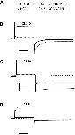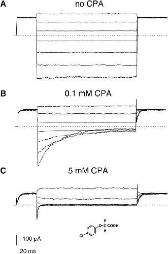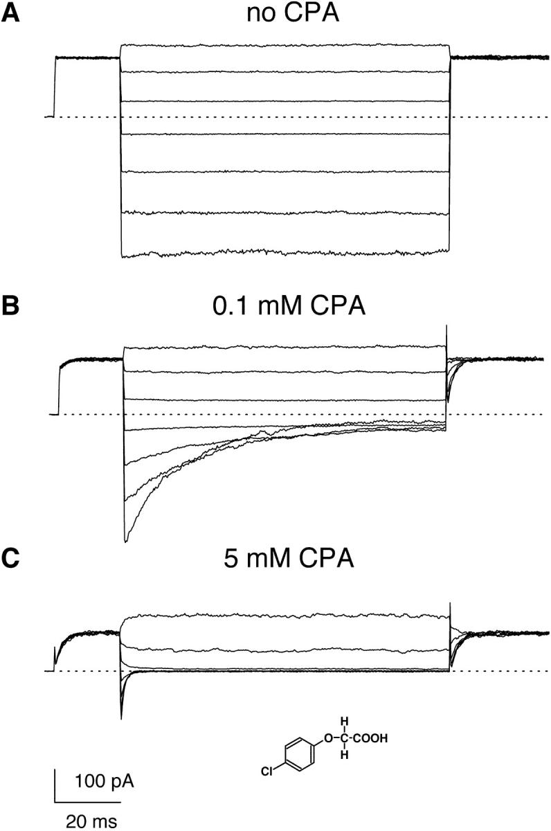 Figure 2. . Inhibition of mutant E166A by CPA. Patch-clamp data from a representative inside-out patch are shown in the absence of CPA (A), and in the presence of 0.1 mM CPA (B) and 5 mM CPA (C). The pulse protocol consists of a prepulse to 80 mV, a test pulse to various potentials (the responses to −140, −100, −60, −20, 20, 60, and 100 mV are shown) and a “tail” pulse to 80 mV. The chemical structure of CPA is shown in C as an inset. Nearly identical results were obtained for the mutation E166S (not depicted).