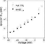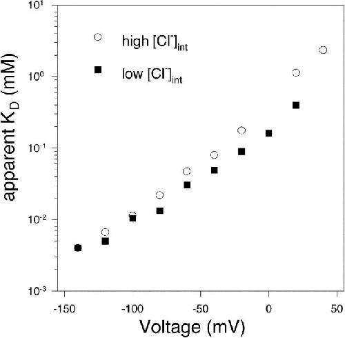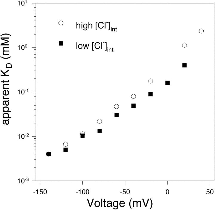 Figure 4. . Block of E166A in low intracellular chloride. The steady-state block was evaluated using an intracellular solution in which 90 mM chloride was replaced by glutamate resulting in a solution with 14 mM Cl− (filled squares). For comparison, the data from Fig. 3 obtained in the regular Cl− solution are also shown (open circles). Data in low Cl− were obtained by the average from three patches.