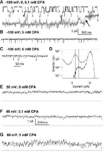 Figure 6. . Recordings from a patch with only a few channels. Representative traces from a single patch held at −100 mV (A–C) or 60 mV (E–G) in the absence of CPA (gray trace in A and E), with 0.1 mM CPA (black trace in A and F), or 5 mM CPA (B, C, and G) are shown. In C a short stretch of the trace in B is shown at a higher time-resolution (filtered at 500 Hz, while the longer traces were filtered at 200 Hz before display). In D a raw amplitude histogram of the recording at −100 mV in the presence of 0.1 mM CPA (gray trace) and 5 mM CPA (black trace) is shown. The vertical lines are drawn at current values of −0.8 and −0.61 pA to highlight the first nonzero peaks of the respective amplitude histograms. The bin-width for the amplitude histograms was 5 fA. The vertical scale bar in A also applies to B and C, and the scale bars in F also apply to E and G. The patch most likely contained two channels with four pores. Similar results were obtained in a total of four patches.