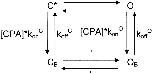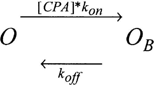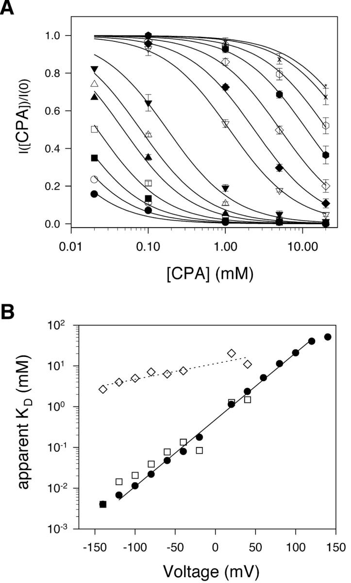Figure 3. . Steady-state inhibition by CPA. The inhibition seen at steady-state is shown in A as a function of [CPA] (filled circles, −140 mV; open circles, −120 mV; filled squares, −100 mV; open squares, −80 mV; filled triangles up, −60 mV, open triangles up, −40 mV; filled triangles down, −20 mV; open triangles down, 20 mV; filled diamonds, 40 mV; open diamonds, 60 mV; filled hexagon, 80 mV; open hexagon, 100 mV; cross, 120 mV; star, 140 mV). Data were obtained by averages from 5 patches. Lines in A are best fits of Eq. 1. The resulting KDapp is shown in B (filled circles) as a function of voltage. The solid line represents a best exponential fit to the data from −120 to 120 mV of the form KDapp(V) = KDapp(0)*exp(z*V/(RT)) with a valence z = 0.96 and KDapp(0) = 0.48 mM. Diamonds represent the open channel KD estimated by the fit of Eq. 3 to the relaxation rates shown in Fig. 8 A and the dotted line indicates an exponential function of the form KD (V) = KD (0)*exp(zO*V/(RT)) with zO = 0.23 and KD(0) = 11 mM. Open squares are calculated from Eq. 2 using the parameters obtained by fitting Eq. 3 to the relaxation rates (see Fig. 8).