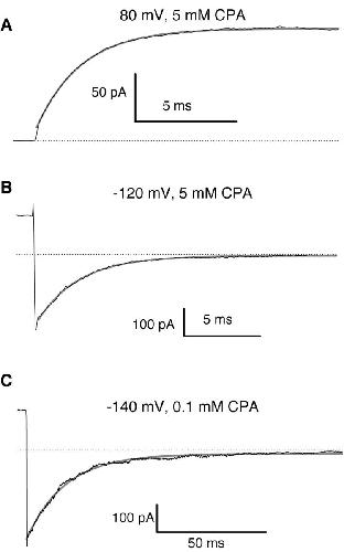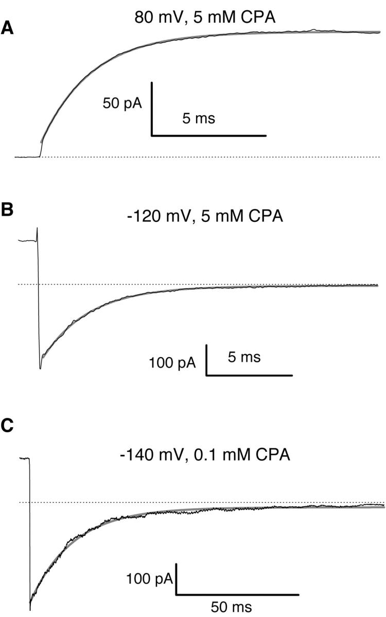 Figure 7. . Single-exponential relaxations of mutant E166A in the presence of CPA. Examples of relaxations in the presence of CPA (A and B, 5 mM; C, 0.1 mM) at 80 mV (prepulse to −140 mV) (A), −120 mV (prepulse to 80 mV) (B), and −140 mV (prepulse to 80 mV) (C) are shown (thin lines) superimposed with single exponential fits (thick gray traces) (time constants, A, 2.2 ms; B, 2.7 ms; C, 17.5 ms).