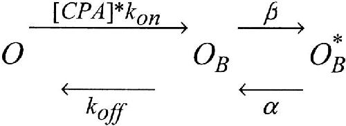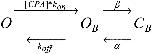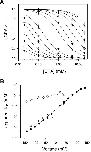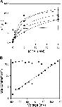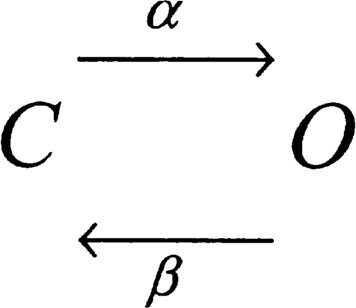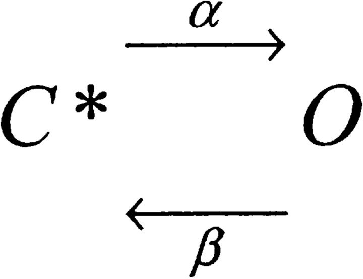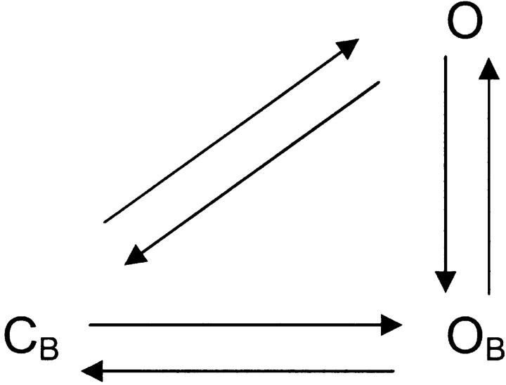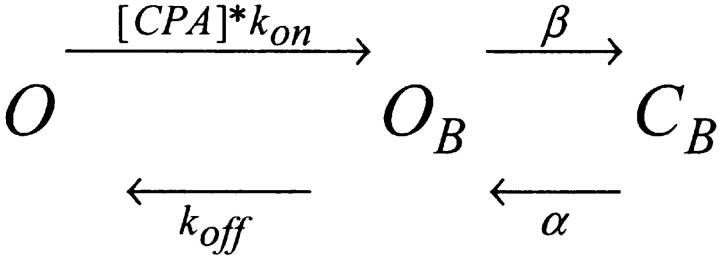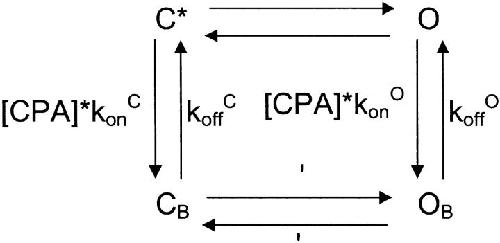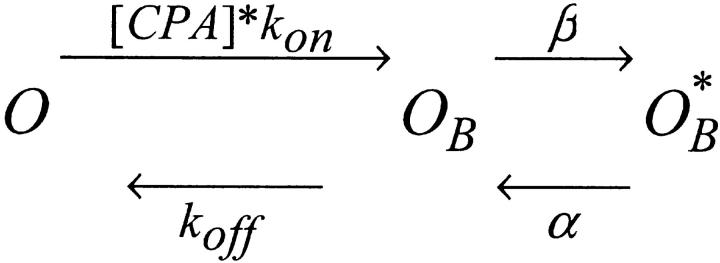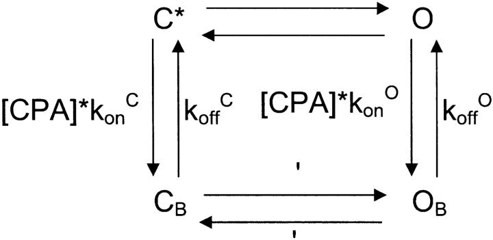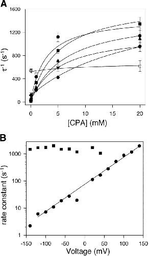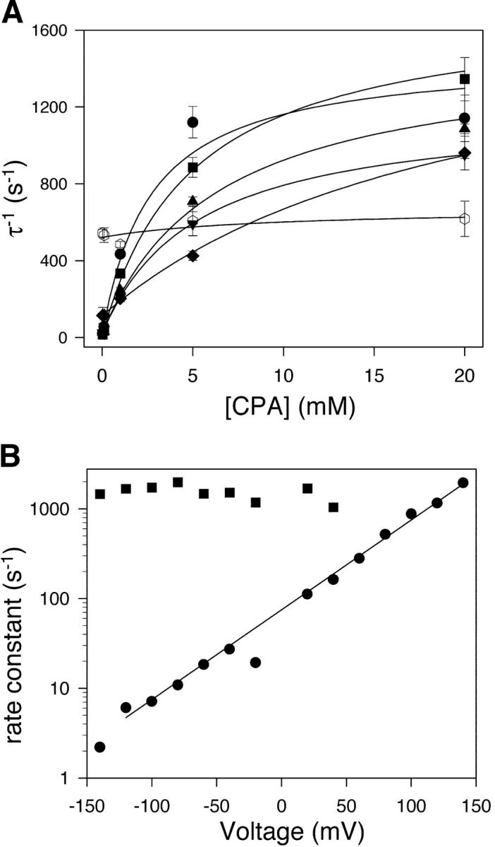 Figure 8. . Kinetic analysis of CPA inhibition of mutant E166A. A shows relaxation rates obtained by fitting single exponential functions to the relaxations of the currents in the presence of CPA for exemplary voltages (circles, −140 mV; squares, −100 mV; triangles up, −60 mV; triangles down, −20 mV; diamond, 20 mV; open hexagons, 80 mV). Lines are fits of Eq. 3 to the data with the parameters α, β, and KD for each voltage. In the positive voltage-range essentially only the opening rate, α, could be determined because the affinity for CPA is too low, so that the second term in Eq. 3 is small compared with α. The resulting open channel KD is shown in Fig. 3 B (diamonds), while α (circles) and β (squares) are displayed in B as a function of voltage. The line in B is a function of the form α(V) = α(0)*exp(zα*V/(RT)) with zα = 0.58 and α(0) = 75 s−1.