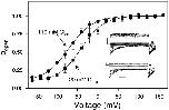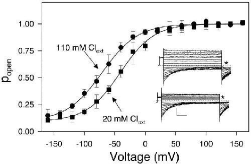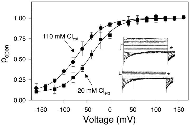 Figure 9. . Effect of reduced [Cl−]ext on CPA block of E166A. The main graph shows the open-probability as a function of voltage of E166A channels with 0.1 mM intracellular CPA in 110 mM [Cl−]ext (circles) and 20 mM [Cl−]ext (squares) (n = 4 each). The inset shows a typical family of voltage-clamp traces measured from an outside-out patch in high (top traces) and low (bottom traces) [Cl−]ext. The asterisk indicates the constant tail pulse at −140 mV. At 0.1 mM CPA practically no inhibition is seen at voltages >80 mV and thus the normalized initial currents at the constant “tail” pulse directly reflect the apparent open-probability at the end of a previous conditioning pulse. The normalized initial current values at this test pulse were thus used to calculate the open-probability. The lines are fits of a Boltzmann function with a voltage of half-maximal activation of −71 mV (high Cl−) and −41 mV (low Cl−). Scale bars in the inset indicate 50 ms and 50 pA, respectively.