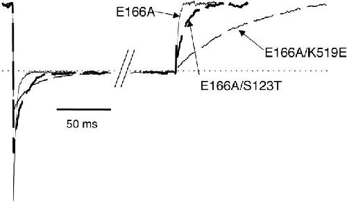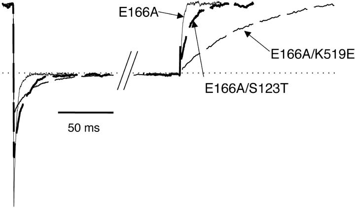 Figure 10. . Effect of additional mutations on the kinetics of CPA block of mutant E166A. Shown are representative current traces measured with 1 mM CPA for mutant E166A (thin black trace), mutant E166A/S123T (dashed gray trace), and mutant E166A/K519E (dashed black trace). None of the mutants show any relaxation in the absence of CPA. The currents are normalized to have similar amplitude at the 80-mV prepulse, that is followed by a pulse to −140 mV, and a repolarization to 80 mV. Note also the strong outward rectification of mutant E166A/K519E, compatible with the known alterations of the open channel properties of the mutant K519E (Pusch et al., 1995; Ludewig et al., 1997a). Similar results were obtained in a total of five patches for each mutant (E166A/S123T and E166A/K519E).