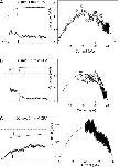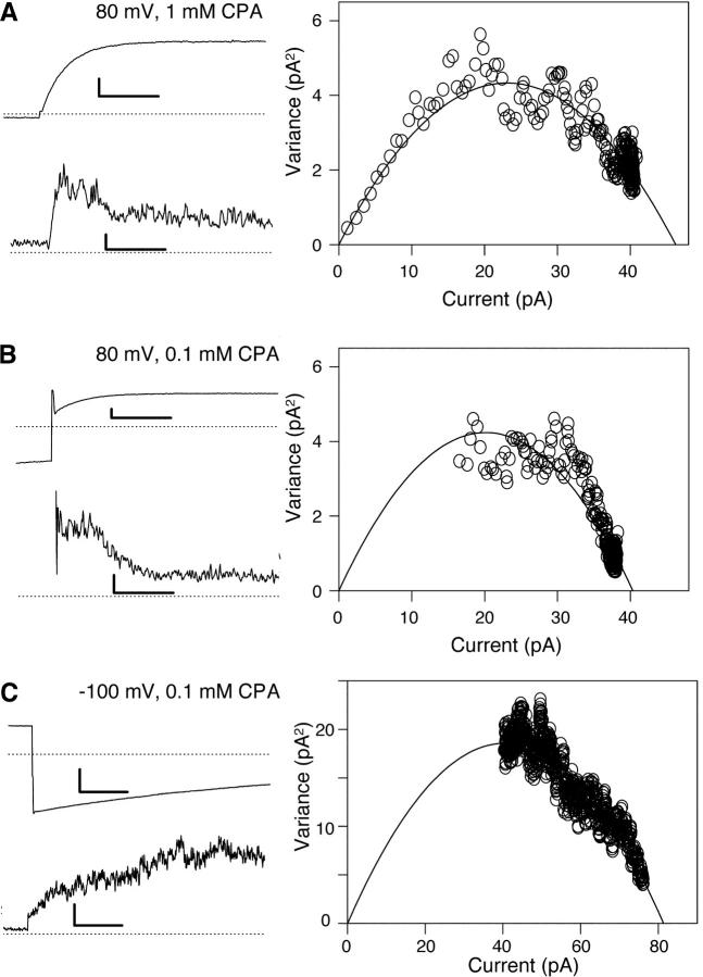 Figure 5. . Nonstationary noise analysis of mutant E166A in the presence of CPA. Examples of nonstationary noise analysis are shown under different conditions from different patches (A, test pulse to 80 mV after a prepulse to −140 mV in the presence of 1 mM CPA; B, test pulse to 80 mV after a prepulse to −140 mV in the presence of 0.1 mM CPA; C, test pulse to −100 mV after a prepulse to 80 mV in the presence of 0.1 mM CPA). On the left are shown the mean (top trace) and the variance (bottom trace), while on the right the variance is plotted versus the mean (symbols) and fitted with a parabola (line) as described in materials and methods. The parameters obtained by the fit are, A, i = 0.37 pA, N = 123, pmax = 0.88; B, i = 0.40 pA, N = 96, pmax = 0.95; C, i = 0.91, N = 89, pmax = 0.94. Bars: 5 ms, 10 pA, 1 pA2 (A and B); 10 ms, 30 pA, 5 pA2 (C). Similar results were obtained in a total of four patches.