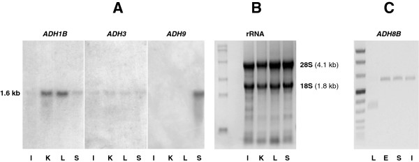 Figure 1. Detection of ADH classes in X. laevis. (A) Northern blot analysis of ADH1B, ADH3 and ADH9 from intestine (I), kidney (K), liver (L) and stomach (S), performed on 15-μg samples of total RNA. (B) Ethidium bromide-stained gel, from the same electrophoresis as in panel (A), showing 18S and 28S rRNAs next to the RNA molecular weight marker (0.24-9.5 kb, Invitrogen). The estimated molecular size of the RNA hybrids detected was ~1.6 kb. (C) RT-PCR of ADH8B from liver (L), esophagus (E), stomach (S) and intestine (I) next to DNA molecular weight marker VIII (Roche). Esophagus, stomach and intestine show an amplification product of 603 bp, indicating the presence of the ADH8B cDNA.