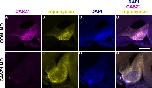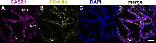 Figure 3. CASZ1 expression in the heart is restricted to the myocardium. AâD: Transverse section (10 μm) through the heart shows CASZ1 expression (A) is excluded from endocardium in the outflow tract (OFT) and atrioventricular canal (AVC) that is surrounded by Fibrillin (B). DAPI (C) and corresponding merge (D). V, ventricle, dorsal is to the topDownload figure to PowerPoint