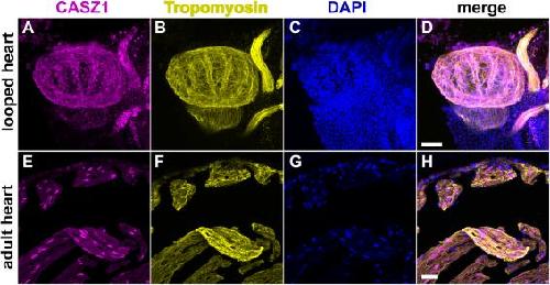 Figure 4. CASZ1 is expressed throughout the myocardium. AâD: Maximum projections of z-stacks (50 μm total) through the looped heart (stage 43; ventral view). EâH: Transverse section (10 μm) of dorsal region of adult heartventricle. anti-CASZ1 (A,E), anti-Tropomyosin (B,F), DAPI (C,G), and corresponding merge (D,H). Scale bars = 50 μm.Download figure to PowerPoint