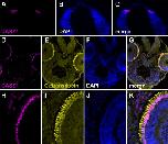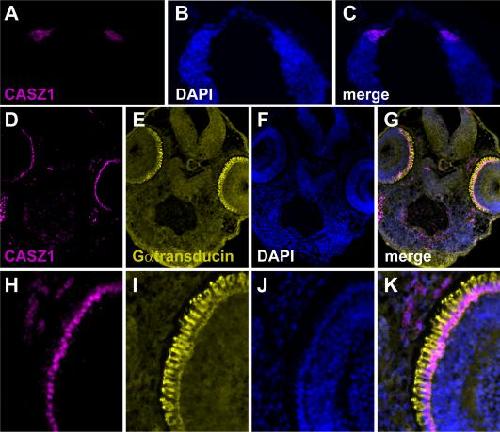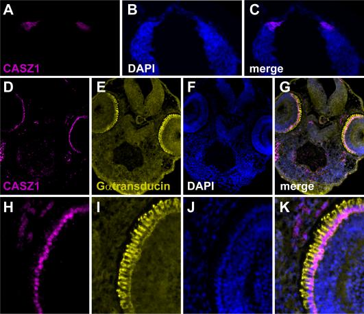 Figure 8. CASZ1 is expressed in differentiated neural tissue during development. AâC: Expression of CASZ1 in the dorsal portions of anterior neural tube. DâK: CASZ1 is present (D,H) in both eyes of stage 42 embryos and colocalizes (G,K) to DAPI-stained nuclei (F,J) of rod photoreceptors marked by Gαtransducin (E,I). Panels HâK are magnified views of eyes in DâG.Download figure to PowerPoint