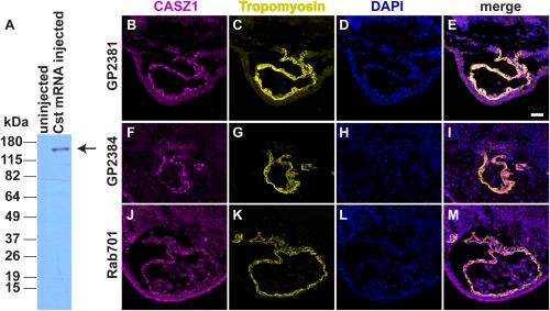 Figure 1. Detection of CASZ1 in Xenopus embryos with anti-CASZ1 antibodies. A: Western blot of crude Xenopus lysates of uninjected and Casz1-V5 mRNA injected embryos (stage 12) demonstrates specificity of GP2381 anti-CASZ1 antibodies. Arrow denotes band corresponding to CASZ1-V5. BâM: Immunofluorescence of stage 40 Xenopus embryos (transverse sections) with three independent anti-CASZ1 antibodies. Both guinea pig antibodies (GP2381 and GP2384) and the single rabbit antibody (Rab701) recognize CASZ1 protein in cardiomyocyte nuclei throughout the heart. Dorsal is to the top. Anti-CASZ1 (B,F,J), anti-Tropomyosin (C,G,K), DAPI (D,H,L), and corresponding merge (E, I, M). Scale bar = 50 μm.Download figure to PowerPoint