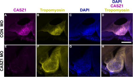 Figure 2. CASZ1 protein is depleted in Casz1 morpholino (MO)-injected embryos. Maximum projections of z-stacks (50 μm total) through the linear heart tube (stage 34) of control (AâD) and MO injected embryos (EâH). Anterior to the left, dorsal to the top. Anti-CASZ1 (A, E), anti-Tropomyosin (B, F), DAPI (C,G), and corresponding merge (D,H). Scale bar = 50 μm.Download figure to PowerPoint