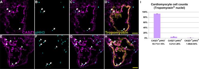 Figure 5. CASZ1 expression in the myocardium is correlated to the cell cycle. AâH: Transverse sections (10 μm, dorsal to the top) through the heart of a wild-type stage 40 embryo, with anti-CASZ1 (A,E), anti-phospho-histone H3 (B,F), merge (C,G), overlaid with anti-Tropomyosin staining (D,H). Arrows denote CASZ1â pHH3+ Tmy+ cardiomyocytes; arrowheads denote CASZ1+ pHH3+ Tmy+ cardiomyocytes. Scale bars = 50 μm. I: Quantification of cell counts of Tropomyosin+ cardiomyocyte nuclei from stage 40 embryos (n = 3; >500 cardiomyocytes scored per animal). Bars indicate standard deviation among animals scored.Download figure to PowerPoint