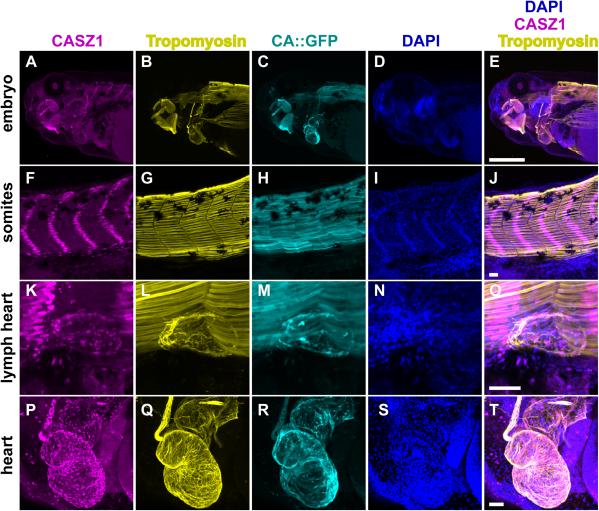 Figure 6. CASZ1 is expressed in all differentiated muscle in the embryo. AâE: Maximum projections of z-stacks (620.96 μm total) of stained stage 43 cardiac actin::gfp embryo, anterior half. FâJ: Maximum projection of z-stacks (102.04 μm total) of magnified view of somites from embryo in AâE. KâO: Maximum projection of z-stacks (59.41 μm total) of magnified view of lymph heart from embryo in AâE. PâT: Maximum projection of z-stacks (180.29 μm total) of magnified view of heart from embryo in AâE. Anti-CASZ1 staining (A,F,K,P), anti-Tropomyosin (B,G,L,Q), anti-GFP (C,H,M,R), DAPI (D,I,N,S), and corresponding merge (E,J,O,T). Anterior to the left, dorsal to the top. Scale bars = 500 μm in E; 50 μm in J,O,T.Download figure to PowerPoint