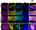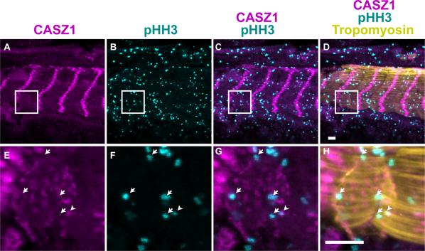 Figure 7. CASZ1 expression in the lymph heart is also correlated to the cell cycle. AâH: Maximal projection of 100 μm of z-stacks through the somites (AâD) and magnified view of lymph heart in white box in panel D (EâH) of a stage 43 embryo, with anti-CASZ1 (A,E), anti-phospho-histone H3, pHH3 (B,F), merge (C,G), and overlaid with anti-Tropomyosin staining (D,H). Arrows denote CASZ1â pHH3+ lymph muscle nuclei. Arrowheads denote CASZ1+ pHH3+ lymph muscle nuclei.Download figure to PowerPoint