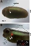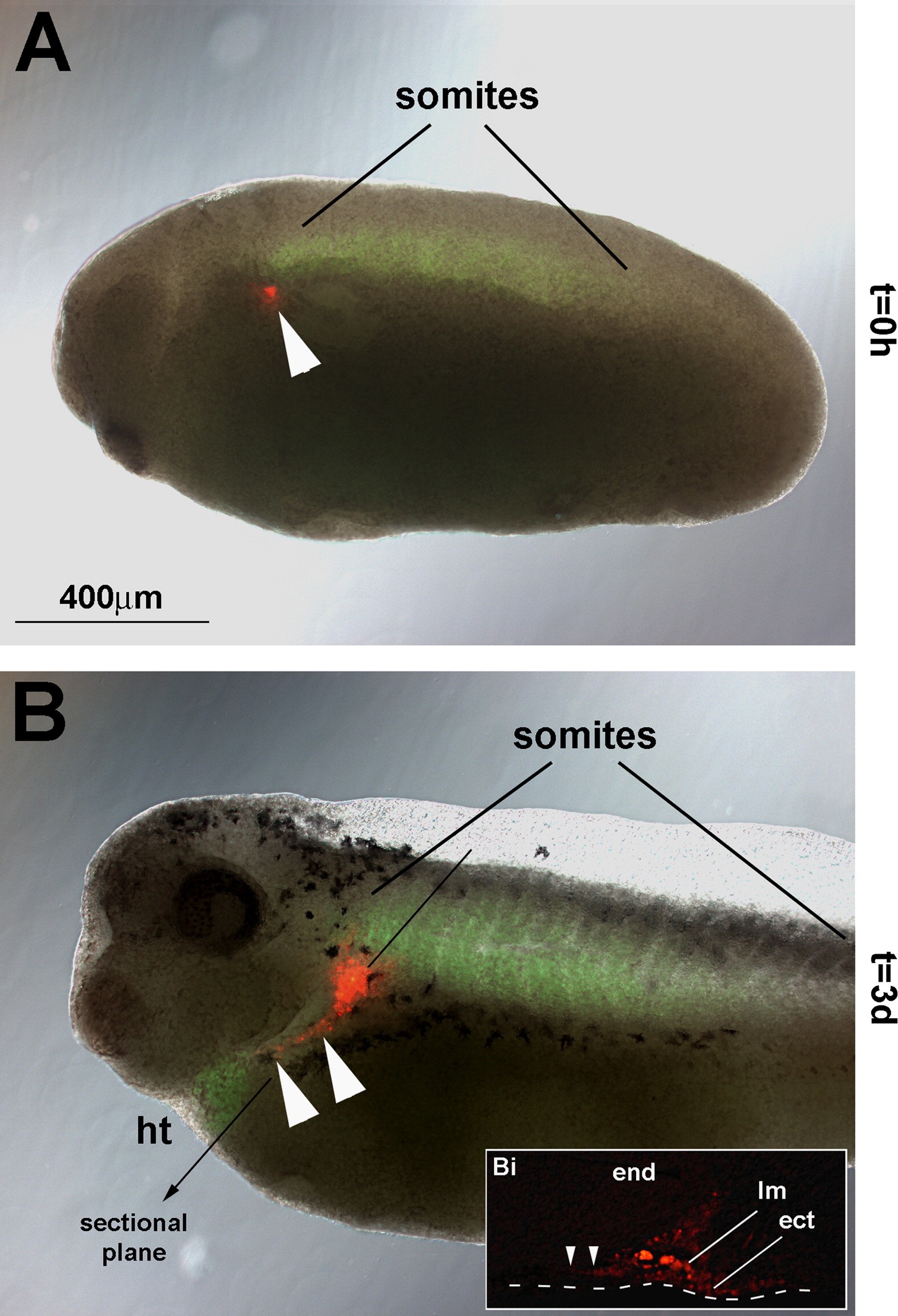 DiI labelling of the Xenopus occipital lateralmesoderm. (A, B) Lateral views of Xenopus laevis transgenic cardiac actin:GFP embryos, rostral to the left, dorsal to the top. (Bi) Section of the embryo shown in (B) along the plane indicated in (B), dorsal to the right, medial to the top. (A) DiI-labelling (arrowhead) of the occipital lateralmesoderm next to the 1st somite (as identified by its green fluorescence) at st 20. (B, Bi) Three days later, the labelled lateralmesoderm has expanded in a ventralârostral direction, surrounding the pharyngeal arches and heading towards the floor of the arches (arrowheads) as previously seen for the chicken. Abbreviations: ect, surface ectoderm; end, endoderm; ht, heart; and lm, lateralmesoderm.