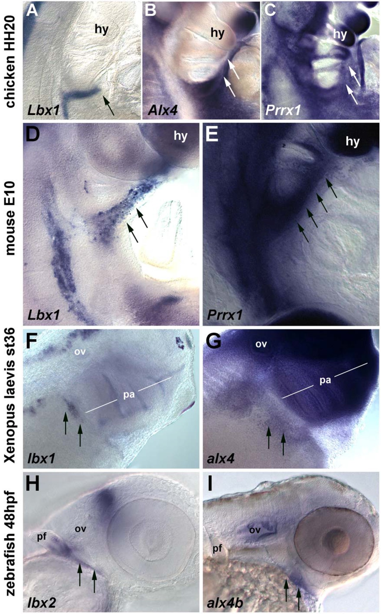 (HMP) express Lbx1 (A,D,F, arrows) or in the zebrafish, the paralogous gene lbx2 (H, arrows). The paired