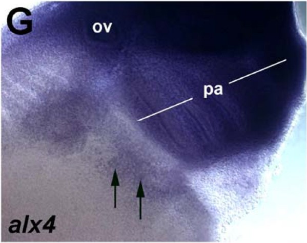 alx4 (ALX homeobox 4 ) gene expression in Xenopus laevis embryo, assayed via in situ hybridization, NF stage 36, lateral view, anteriorright, dorsal up.