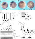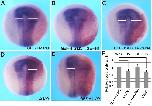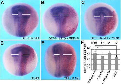 Fig. 2. Changes in the Sox2-positive domain in GEF-H1 morphants. (AâE) Embryos were injected laterally into two sites at the four-cell stage with LacZ RNA as lineage tracer (40â pg) and morpholino oligonucleotides or RNAs as indicated. Doses were as follows: (AâC) GEF-H1a MO and (D) CoMO (control) (20â ng), (E) GEF-H1 MO (40â ng) and human GEF-H1 RNA (GEF-H1; wt) (60â pg) or human GEF-H1-Y393A RNA (Y393A) (800â pg). Whole-mount in situ hybridization with a Sox2 probe at stages 14â15 is shown, β-galactosidase activity (red) marks the injected side. A dorsal view is shown, the anterior is top. (B) Wild-type human GEF-H1 but not the (C) inactive GEF-H1-Y393A RNA reverses the morphant phenotype (A). (AâE) White bars indicate the width of the Sox2 expression domain at the level of the mid-hindbrain boundary. (F) Quantification of embryo phenotypes. The Sox2 domain was measured at the mid-hindbrain boundary as indicated in AâD. The ratios of the Sox2 domain width on the injected side over that on the uninjected side are shown. A ratio of 1.0 indicates equal width of the Sox2 domain on both sides. Statistical significance was assessed by using Student's t-test. ***P<0.0001. The n values are shown across the top of the graph and indicate the number of embryos that were measured. |