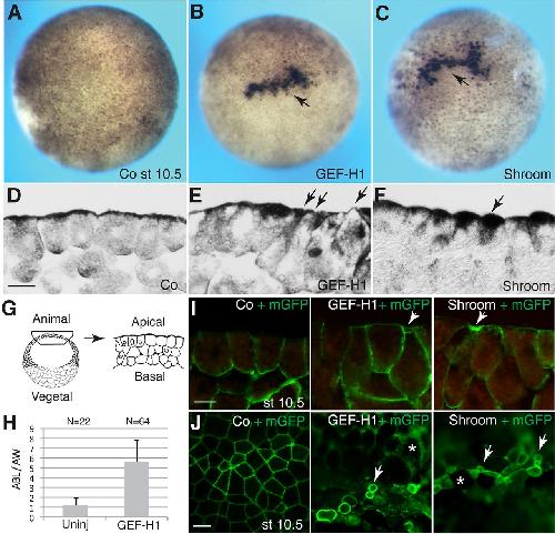 Fig. 5. GEF-H1 induces ectopic apical constriction in ectodermal cells. (AâC) Ectopic apical constriction induced by GEF-H1 and Shroom in ectoderm. Four-cell embryos were injected with RNAs and cultured until late-blastula or early-gastrula stages (9â10+). (A) Uninjected control (Co) embryo. (B) Embryo injected with Xenopus MycâGEF-H1 RNA (50â pg). (C) Embryo injected with Shroom RNA (200â pg). Arrows point to the areas undergoing apical constriction. Top view is shown. (DâG) Cross-sections of embryos that had been injected with human GEF-H1-Y393A (D) or human GEF-H1-C53R (E) or Shroom (F) RNA. Ectoderm cells accumulate pigment at the apical surface and reduce their apical surfaces (arrows). Human GEF-H1-Y393A-expressing cells are indistinguishable from control uninjected ectoderm. (G) Scheme of the experiments showing the tissue sectioned in (DâJ), apical is up. (H) Quantification of cell shape in GEF-H1-expressing and control (uninj) cells. Results are expressed as ratios of apical-basal cell length over apical width (ABL/AW) in the superficial layer cells (as shown in D and E). Means±s.d. are shown. The numbers above the bars indicate the number of cells counted per group (n). Five GEF-H1-expressing and two control embryos were examined. Statistical significance was assessed by Student's t-test, P<0.0001. (I) Morphology of cells that underwent apical constriction (arrows) from embryos that had been injected with Xenopus MycâGEF-H1 (50â pg) or Shroom (200â pg) RNAs as indicated. The cell membrane is marked by co-expression of membrane-targeted GFP (mGFP), which was detected by using an antibody against GFP (green). Co, control ectoderm. (J) En face views of ectoderm from the experiment in I. Arrows point to cells that express Xenopus Myc-GEF-H1 or Shroom with membrane-associated GFP (mGFP). Live embryos are shown. * uninjected cells. Scale bars: 20â µm. |