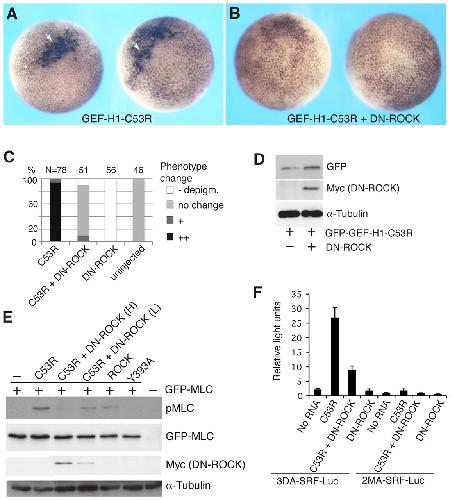 Fig. 7. ROCK is required for GEF-H1-induced ectopic apical constriction. (A,B) Four-cell embryos were injected with GEF-H1-C53R (60â pg) and/or dominant-negative ROCK (DN-ROCK, 400â pg) RNAs into two animal-ventral blastomeres. The animal pole view of stage-8.5 embryos is shown. (A) Intense pigmentation (arrows) accompanies apical constriction in response to expression of GEF-H1-C53R. (B) Dominant-negative ROCK completely blocks the effect of active GEF-H1. (C) Quantification of phenotypic changes for embryos that had been injected with the indicated RNAs. Scoring: ++, hyper-pigmentation; +, weak hyperpigmentation; no change, normal morphology; â, de-pigmentation. Pigment accumulation was associated with apical surface reduction and constriction. The y-axis shows the percentage of embryos with the indicated phenotype. The numbers across the top indicate the total number of embryos examined. (D) Protein levels for GFP-GEF-H1-C53R and Myc-tagged dominant-negative ROCK were assessed by using antibodies against GFP and Myc in embryo lysates taken from experiments performed in A and B. (E) Dominant-negative ROCK suppresses GEF-H1-dependent MLC phosphorylation (pMLC). Four-cell embryos were injected into four animal blastomeres with RNAs encoding GFPâMLC (250â pg), GEF-H1-C53R (C53R, 60â pg), GEF-H1-Y393A (Y393A, 500â pg), dominant-negative ROCK (400â pg, H, high dose; 200â pg, L, low dose), or wild-type ROCK (ROCK, 250â pg) as indicated. Injected embryos were lysed at stage 8.5 for western blotting analysis with antibodies against pMLC. Antibody staining against Myc and GFP shows the levels of dominant-negative ROCK and GFPâMLC, respectively. α-tubulin is loading control. (F) ROCK is required for GEF-H1-mediated SRF-Luc reporter activation. 20â pg of SRF reporter (3DA-SRF-Luc or mutated 2MA-SRF-Luc) DNAs were co-injected with RNAs encoding GEF-H1-C53R (60â pg) and dominant-negative ROCK (250â pg) into two dorsal-animal blastomeres of four-cell embryos, as indicated. The relative luciferase activity was measured in lysates of embryos harvested at stage 10.5. Means±s.d. are shown. Every group included four independent sets, each containing four embryos. |