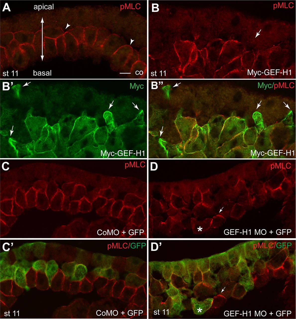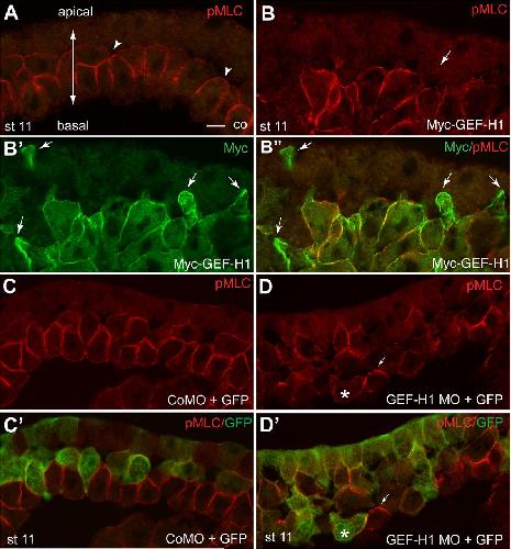 Fig. 8. GEF-H1 regulates protrusive behavior and the polarized distribution of phosphorylated myosin light chain in inner ectoderm cells. (AâD) Immunostaining of transverse ectoderm sections of stage-11 (st 11) embryos that had been injected with the indicated morpholino oligonucleotides (40â ng) or MycâGEF-H1 mRNA (5â10â pg). GFP is a lineage tracer. (A) In control (Co) ectoderm, phosphorylated MLC (pMLC) is enriched at the apico-lateral boundaries of inner cells (arrowhead). The apicalâbasal axis is indicated. (B) Overexpression of MycâGEF-H1 leads to the formation of apical GEF-H1-positive protrusions in inner ectoderm cells (arrow, n>25). pMLC staining is shown (red). Bâ² shows the staining of Myc (green) in the same field as that shown in B. Bâ² shows the merged image of B and Bâ². (C,D) The GEF-H1 morpholino oligonucleotide (GEF-H1 MO, D) but not the control morpholino oligonucleotide (CoMO, C) interferes with pMLC (red) polarization and causes disorganized inner cell morphology in the ectoderm of injected embryos (n>25). Câ² and Dâ² show merged images of the pMLC staining from the corresponding panel with localization of GFP. * lack of pMLC staining in GEF-H1-depleted cells as compared with that of uninjected cells (arrow). Scale bar: 20â µm. |