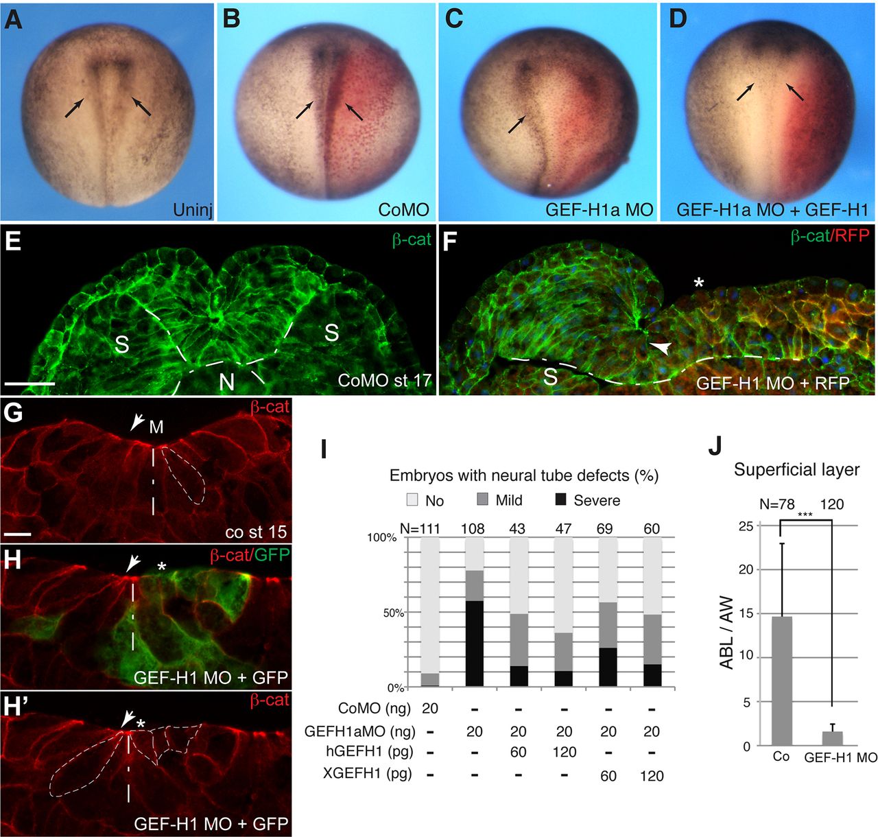 Fig. 1. Neural tube defects in embryos depleted of GEF-H1. (A) Uninjected embryo at stage 16. (BâD) Four-cell embryos were unilaterally injected with control (CoMO) (B), or GEF-H1a (GEF-H1a MO) (C,D) morpholino oligonucleotides (20â ng each) and LacZ RNA (40â pg). (D) Human GEF-H1 RNA (60â pg) rescued the neural fold defect that was caused by GEF-H1a MO. The dorsal view is shown, anterior is to the top. Arrows point to the neural folds. (E,F) Neural fold morphology in stage-17 (st 17) embryos that had been injected with CoMO (40â ng) (E) or GEF-H1 MO (F) (40â ng) was visualized by using β-catenin staining (green). Membrane-associated RFP RNA (160â pg) (F) marks the injected side of the embryo. N, notochord; S, somite. Tissue boundaries are demarcated by broken lines. Arrowhead points to constricting cells, * lack of apical constriction. (G,H) Constricted cell morphology in the cross-sections of neurula embryos (stage 15) that had been unilaterally injected with GEF-H1 MO (40â ng). (G) control (co) embryo. (H) GFP (green) is a lineage tracer, (Hâ²) red channel only of H. The broken lines in G and Hâ² show the cell boundaries. M, midline position, dorsal is at the top. Arrows point to constricting cells, * lack of apical constriction. (I) Quantification of neural fold defects caused by the injection of GEF-H1a MO and the rescue with human or Xenopus GEF-H1 RNA. Morpholino oligonucleotides and RNAs were injected at the indicated doses. Neural tube defects were scored at stages 16â18 as described in supplementary material Fig. S1. The number of embryos that were scored is shown along the top. (J) Quantification of cell shape in superficial neuroectoderm from GEF-H1-MO-injected or control uninjected sides. Results are expressed as the ratios of apical-basal length over the apical width (ABL/AW) in four to six superficial cells that were located adjacent to the midline. Means±s.d. are shown. Cells were scored in 8â11 sections from three embryos, with the total cell number shown on top of each group. Statistical significance was assessed by using Student's t-test, P<0.0001. Scale bars: 100 µm (E); 20 µm (G). |