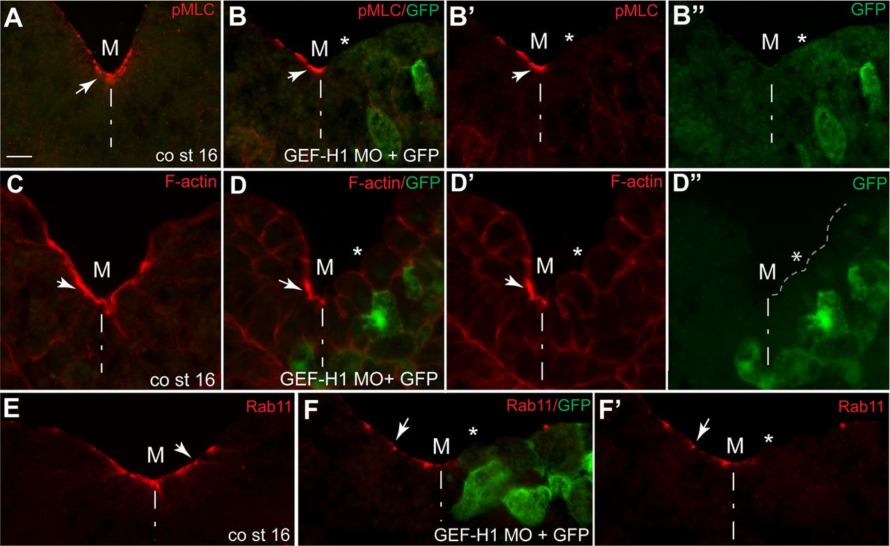Fig. 3. Depletion of GEF-H1 interferes with apical constriction in the neural plate. Four-cell embryos were unilaterally co-injected with 40â ng of morpholino oligonucleotide against GEF-H1 (GEF-H1 MO) and 200â pg of GFP RNA (as a lineage tracer; green). Immunostaining of transverse neural fold sections (in stage-16 embryos) for apical constriction markers. The uninjected side served as a control (co st 16). Arrows point to the uninjected area, * cells that had been injected with GEF-H1 MO. The midline (M) is indicated by the broken line. (A,B) phosphorylated myosin II light chain (pMLC; red), (C,D) F-actin, (E,F) Rab11. Control-MO-injected embryos (supplementary material Fig. S1DâF) were indistinguishable from the uninjected embryos. Bâ², Dâ², Fâ² show the images in the corresponding panel in the red channel only; Bâ²â² and Dâ²â² show the images in the corresponding panel in the green channel only. Scale bar: 20â µm. |