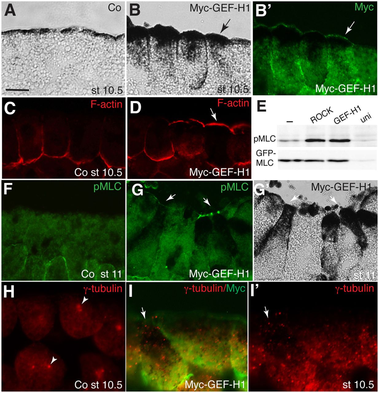 Fig. 6. GEF-H1 activates actomyosin contractility in superficial ectoderm. (A,B) Cross-sections of superficial ectoderm that expressed Xenopus Myc-GEF-H1 RNA (25â50â pg). RNA injections were as described in the Fig.â 5 legend. (A) Brightfield image of uninjected ectoderm (Co). (B) Brightfield view of GEF-H1-expressing cells that are elongated and highly pigmented. (Bâ²) Myc-staining shows apical enrichment of Xenopus Myc-GEF-H1 in constricting cells, which are elongated and heavily pigmented (arrow). (C,D) Accumulation of apical F-actin (red) revealed by Phalloidin staining (arrow) in cross-sections of Xenopus Myc-GEF-H1-expressing ectoderm (D), but not in uninjected control tissue (C). (E) GEF-H1 and ROCK activate MLC phosphorylation (pMLC). Immunoblot analysis of lysates of stage-11 embryos, which had been injected with GEF-H1 and ROCK RNA, using antibodies against phosphorylated MLC. No change in total GFPâMLC levels is detected (antibody against GFP). (F,G) Accumulation of pMLC (green) in GEF-H1-expressing cells. (F) Control uninjected embryonic ectoderm. (G) Accumulation of pMLC at constricted apical surfaces (arrows) of Xenopus Myc-GEF-H1-expressing cells. Gâ², Brightfield reveals elongated âbottle cellâ morphology (arrows) with reduced apical surfaces and increased pigmentation. (H,I) GEF-H1 induces γ-tubulin redistribution (red). (H) Control ectoderm at stage 10.5 showing centrosomal localization (arrowheads). (I,Iâ²) Myc-GEF-H1 RNA-injected ectoderm with constricting cells (arrow). Iâ² shows the red channel only. Scale bars: 20â µm. |