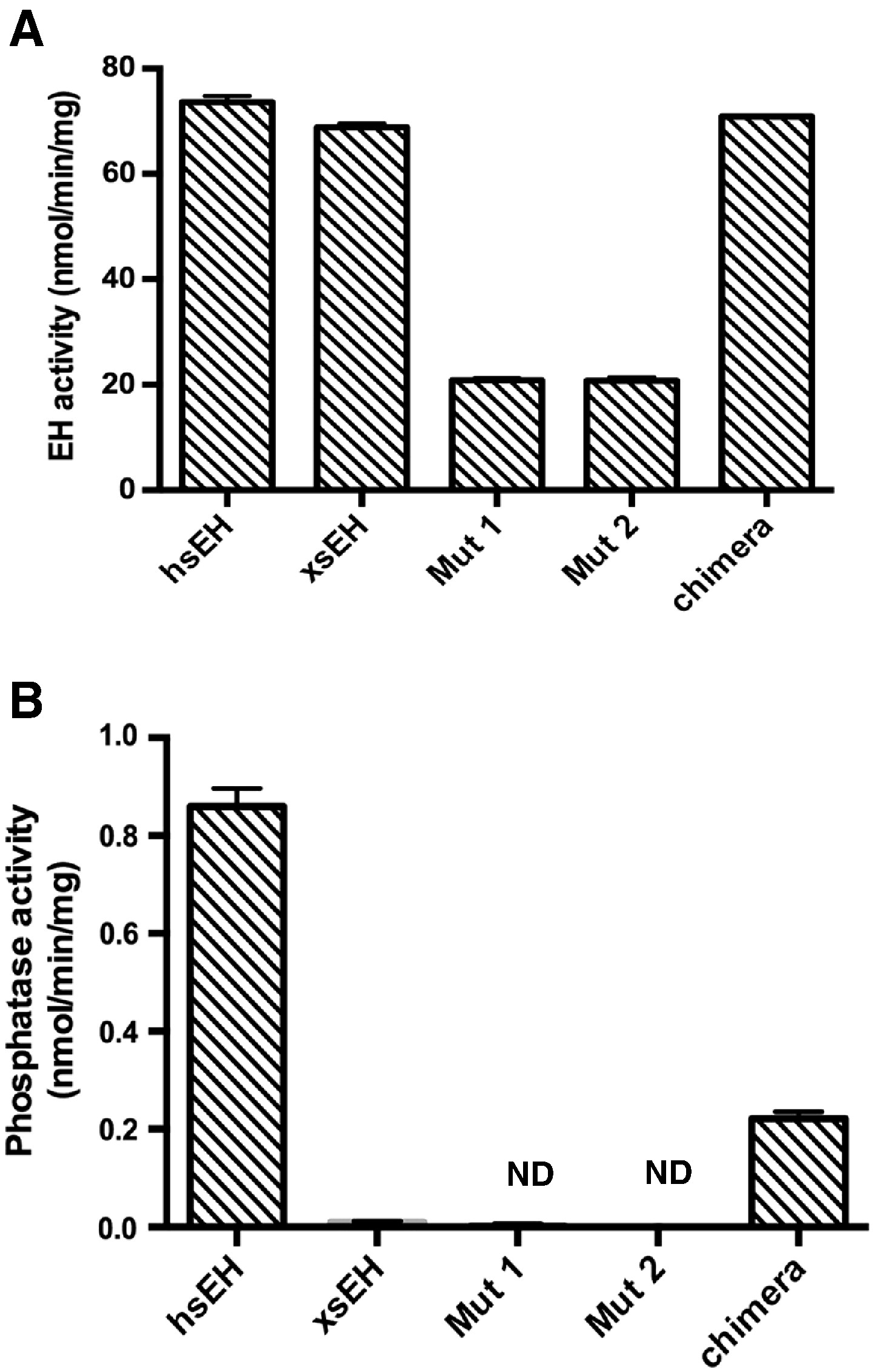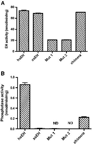 The epoxide hydrolase and phosphatase activities of Xenopus and human sEH. (A) EH activities of Xenopus wild-type, mutant 1, mutant 2, and chimera sEH were assessed using purified protein (0.5 μg) toward 25 μM PHOME. (B) Purified sEH (5 μg) was incubated with 0.5 mM 4-methylumbelliferyl phosphate. The fluorescence of 4-methylumbelliferone was measured every 1 min for 60 min at 330 nm (excitation) and 465 nm (emission).