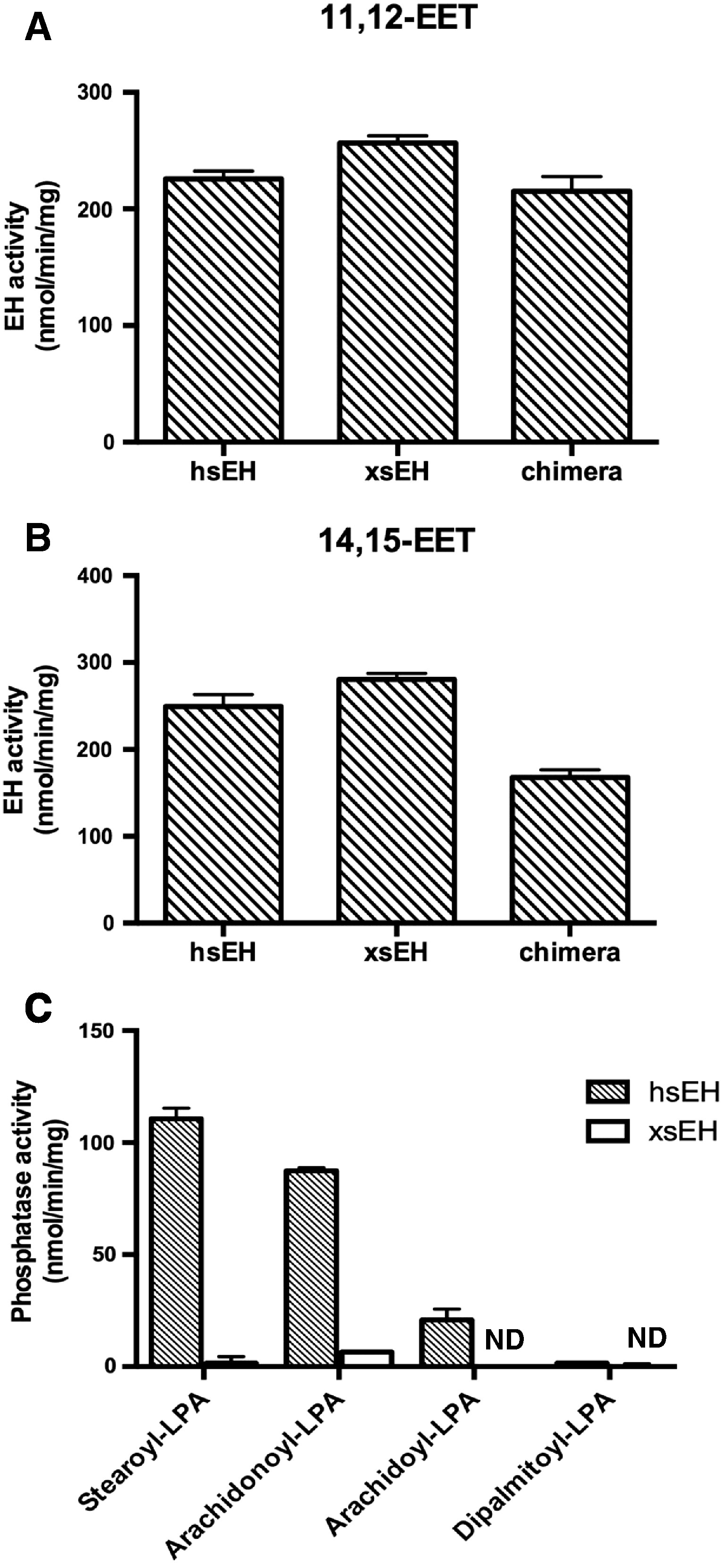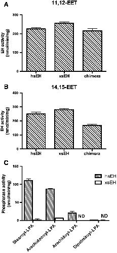 EH activities of Xenopus, human and chimera sEH toward 11,12-EET and 14,15-EET and their phosphatase activities toward LPAs. (A and B) Purified Xenopus, human or chimera sEH (6 μg) was incubated with 10 μM 11,12 EET (A) or 14,15 EET (B) at 37 °C for 15 min then analyzed by HPLC-ELSD. (C) Purified human sEH, or Xenopus sEH (0.6 μg) was incubated with 10 μM stearoyl-LPA, arachidonoyl-LPA, arachidoyl-LPA, and dipalmitoyl-LPA, and the phosphatase activities were detected by malachite green. Results are expressed as the mean ± SD of three separate experiments.