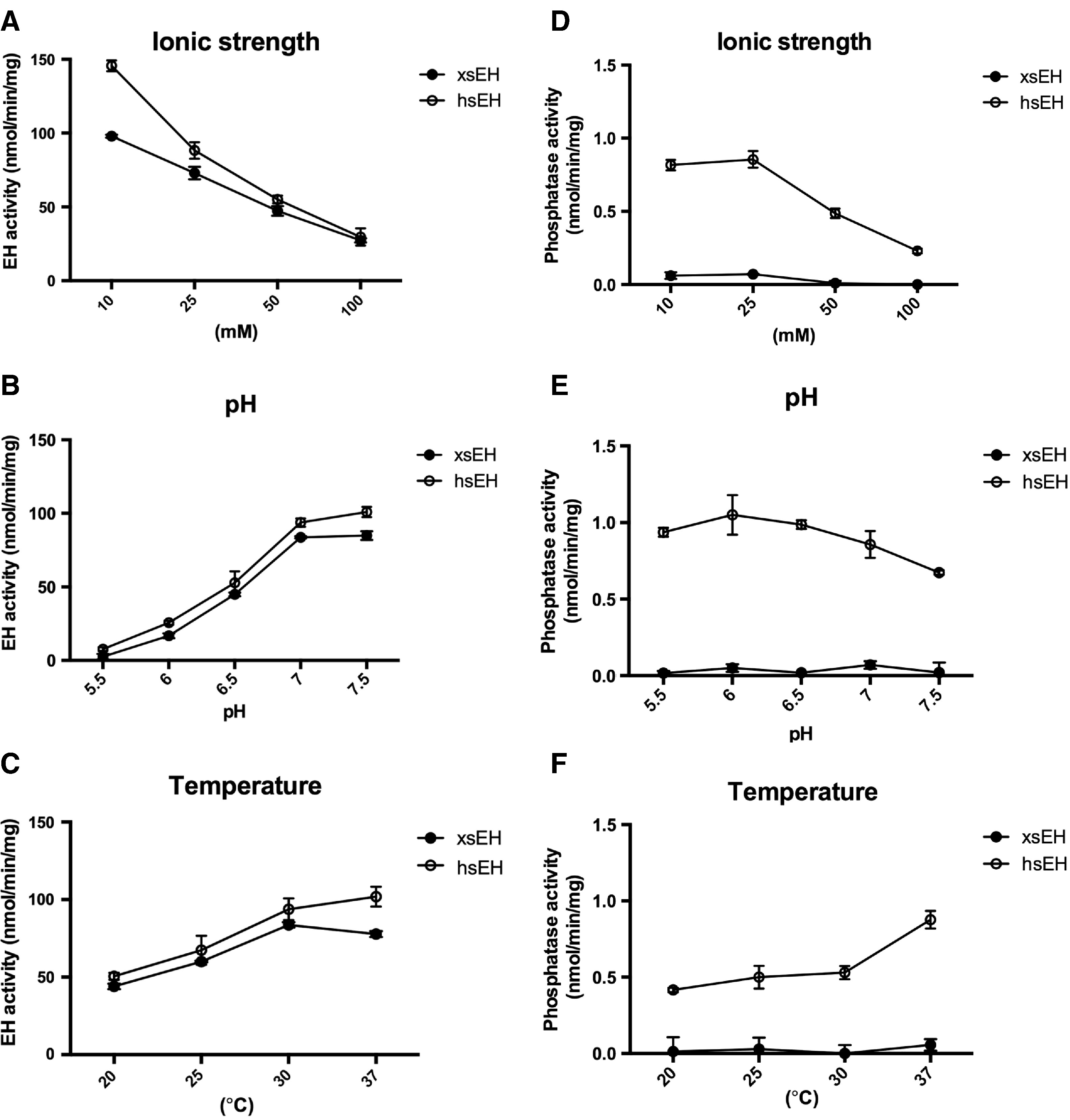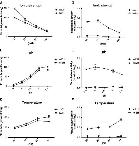 The effects of ionic strength and pH of buffer, and reaction temperature on catalytic activities of Xenopus and human sEH. (A) Purified Xenopus sEH or human sEH (0.5 μg) was incubated with 25 μM PHOME with 10, 25, 50, or 100 mM Bis Tris buffer pH 7.0 at 30 °C. (B) EH activities toward 25 μM PHOME in 25 mM Bis Tris buffer, pH 5.5, 6.0, 6.5, 7.0 or 7.5, at 30 °C. (C) EH activities in 25 mM Bis Tris buffer pH 7.0 at 20, 25, 30, or 37 °C. (DâF) Purified sEH (5 μg) were each incubated with 0.5 mM 4-methylumbelliferyl phosphate in the various conditions described above.