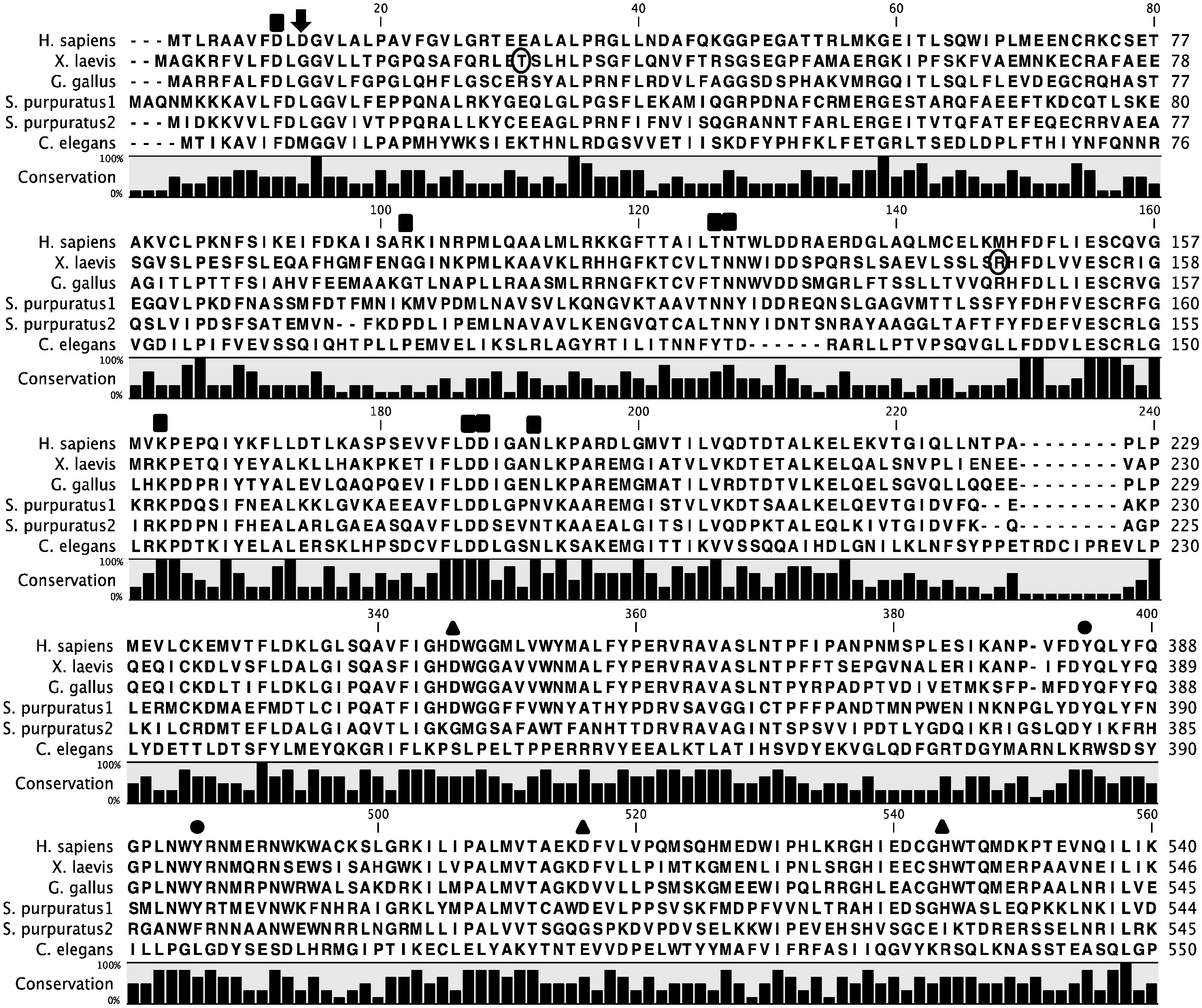 Sequence alignment between Xenopus sEH and sEH derived from other species. Black boxes indicate the active sites of phosphatase activity. The arrow indicates a different amino acid of the phosphatase active site between human and Xenopus sEH. Thr27 or Arg146 indicated by an open circle was substituted by Asn or His, restrictively, in the isolated Xenopus sEH.