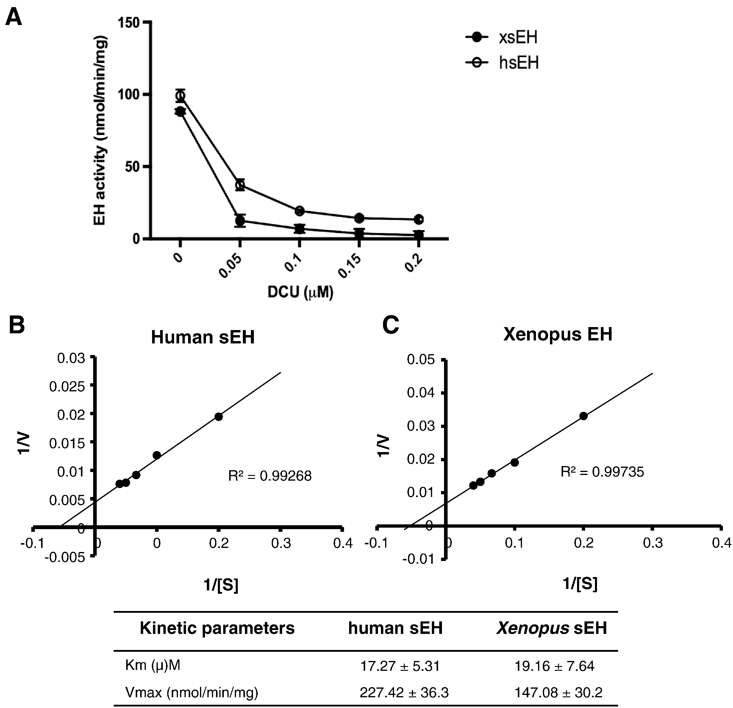Inhibition of EH activity by DCU and kinetic analysis of EH activity. (A) Purified Xenopus sEH or human sEH (0.5 μg) was incubated with 25 μM PHOME in the presence of 0.0â0.2 μM DCU. (B, C) LineweaverâBurk plots of the epoxide hydrolase activities toward PHOME and the kinetic parameters were obtained using GraphPad Prism enzyme kinetic software. Results are expressed as the mean ± SD of triplicate experiments.