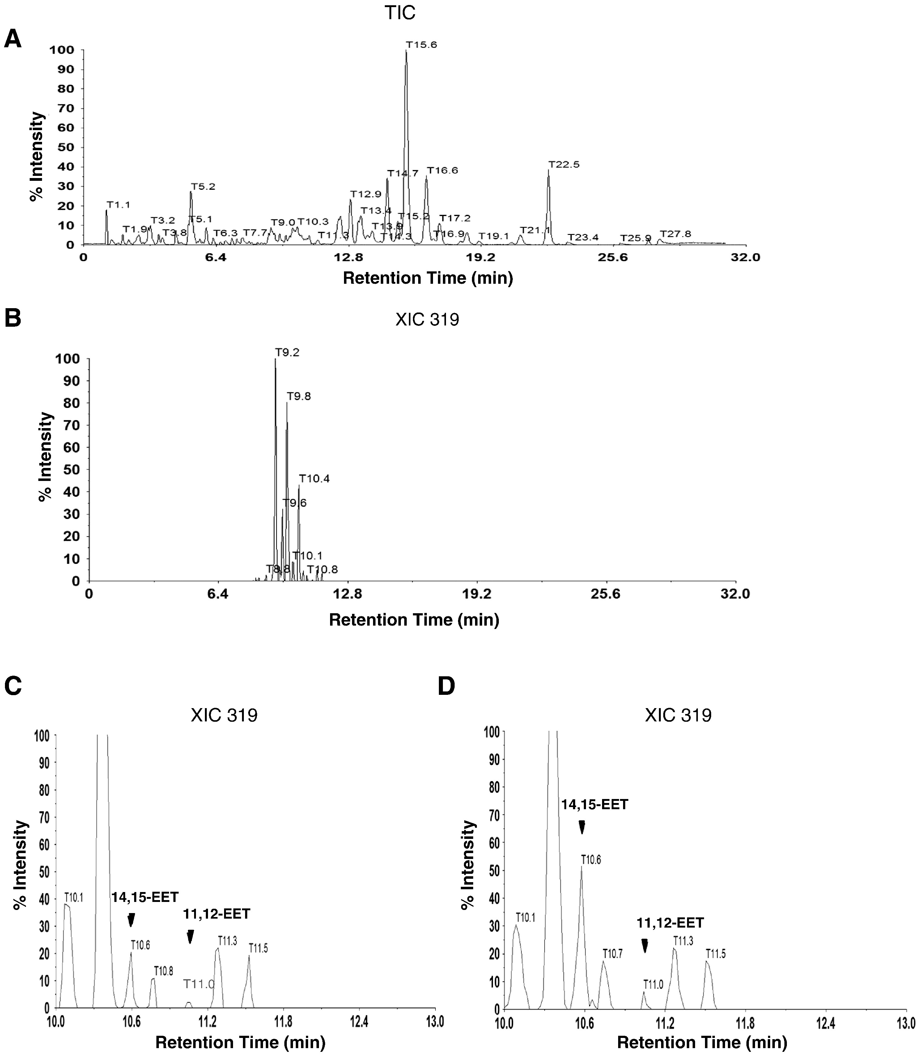 Detection of 11,12-EET and 14,15-EET in Xenopus liver by LCâMS. Xenopus liver (80 mg) were homogenized and analyzed by UPLC/ESI/MS. (A) The total ion chromatogram of Xenopus liver. (B, C) The selected ion chromatogram with m/z 319 (EETs). (D) Selected ion chromatogram with m/z 319 of Xenopus liver by the addition of authentic 11,12-EET and 14,15-EET (0.4 pmol). TIC, total ion chromatogram; XIC, extracted ion chromatogram.