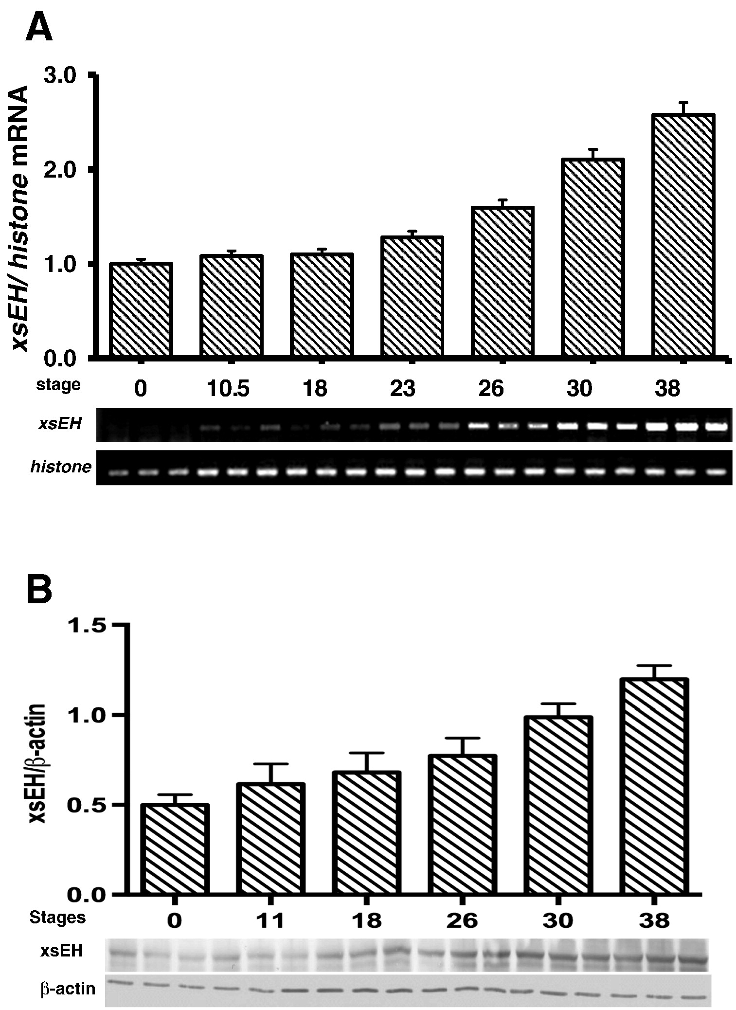 The mRNA and protein levels of sEH in Xenopus embryos. (A) Xenopus sEH mRNA levels were detected at the stages 0, 10.5, 18, 23, 26, 30, and 38 of Xenopus embryo. Total RNA was isolated from embryos and RT-PCR was performed. Amplified DNA fragments were analyzed by electrophoresis with 2% agarose gel. The values on the graphs are the mean ± SD of three separate samples. Band intensity was measured by NIH Image and normalized to that of histone. (B) sEH protein levels in Xenopus embryos were detected by Western blotting. Ten embryos were homogenized and separated into three distinct layers: lipid, cytoplasmic, and pigment granule/yolk. The cytoplasmic layer (30 μg protein) was subjected to SDS-polyacrylamide gel electrophoresis and analyzed by Western blotting with the antibody against human sEH or β-actin. Xenopus sEH protein levels were normalized by the expression level of β-actin protein. The values on the graphs are the means ± SD of three separate samples.