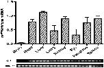 sEH mRNA distribution in several tissues of Xenopus laevis. Total RNA was isolated from the brain, heart, liver, lung, kidney, eye, pancreas, and spleen and converted to cDNA. The amplified DNA fragments were run on an agarose gel (1%) and visualized with ethidium bromide staining. The band intensity of sEH was normalized by histone and quantified using NIH Image. The values on the graphs are each the means ± SD of three separate samples.