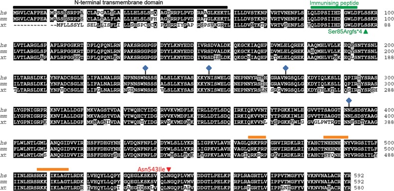 Figure 1. Alignment of the Xenopus heparanase 2 protein sequence with human and mouse orthologues. Xenopus heparanase 2 shares 80% identity (black highlight) and 88% similarity (black plus grey highlight) with human heparanase 2. The majority of non-conserved amino acids are in the N-terminal region (black bar), predicted to constitute a signal peptide. Putative HS-binding motifs are indicated by orange bars. Glycosylated amino acids are indicated by blue diamonds. Asn543, which undergoes a missense mutation in UFS (10), is conserved between species. The immunizing peptide used to generate the heparanase 2 antibody used in this study is indicated in green as is the nonsense mutation created by injection of the splice acceptor morpholino (MO1).