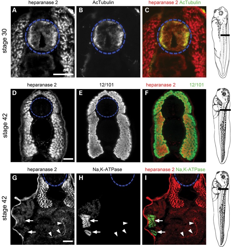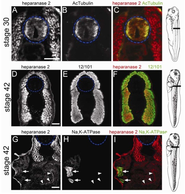 Figure 3. Tissue-specific localization of heparanase 2. Transverse sections through the trunk of Xenopus embryos, as indicated in the diagrams shown on the right, imaged by immunofluorescence, with the neural tube outlined by blue dashed circles. In merged images, heparanase 2 localization is indicated in red while other proteins are indicated in green. (AâC) Heparanase 2 colocalized with acetylated α-tubulin (AcTubulin) in the lateral zones of the Stage 30 neural tube. The flanking myotomes were also positive for heparanase 2. (DâF) At Stage 42, heparanase 2 was absent in the neural tube but myotomes, co-immunostained with the muscle-marker antibody 12/101 (it is the name of an antibody), remained positive. (GâI) The Stage 42 pronephric tubule did not display a specific IHC signal for heparanase 2; note that here, the weak signal is background autofluorescence. The two arrows indicate a proximal tubule which in H and I is seen to be reactive with Na+/K+-ATPase antibody. The set of three arrowheads in (G)â(I) demonstrate specific heparanase 2 immunostaining in the apical zone of epithelia lining the gut lumen. Scale bars are 50 µm.