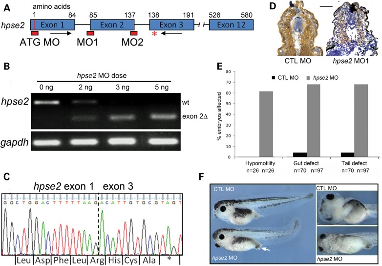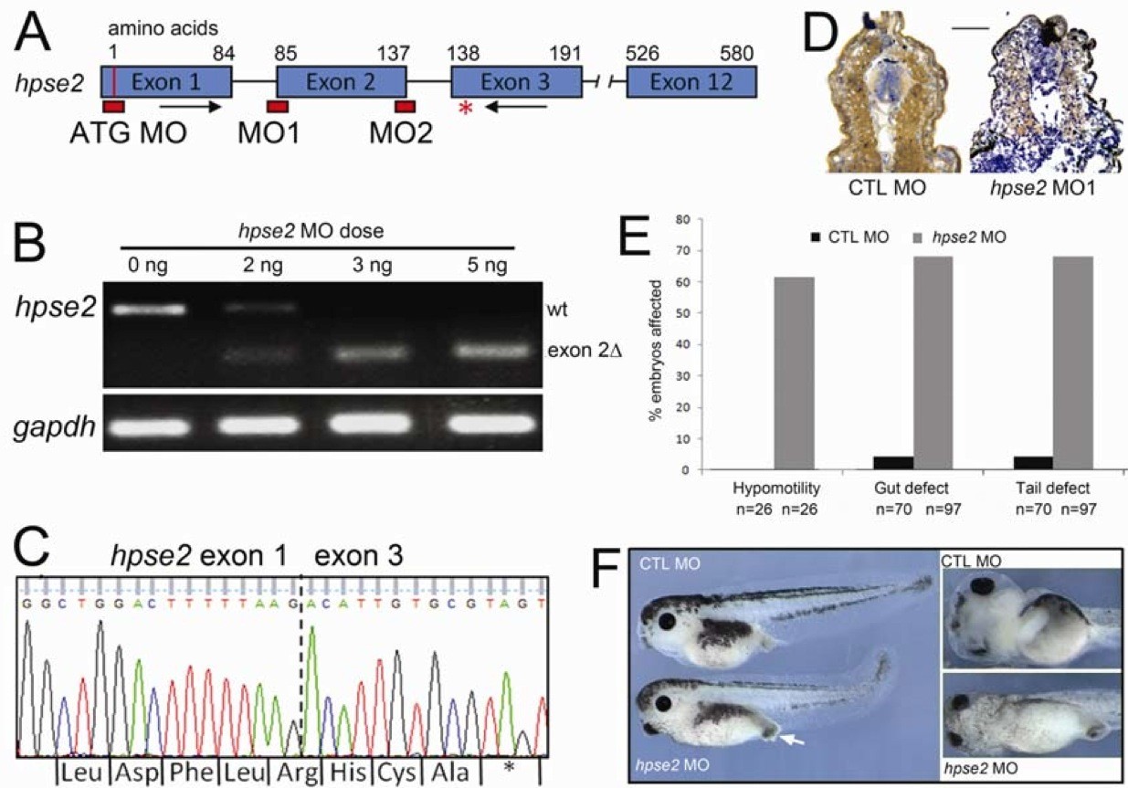 Figure 4. Morpholino knockdown of heparanase 2. (A) Schematic diagram of the X. tropicalis hpse2 gene, showing: exons (blue blocks); ATG MO and splice MO targets (red blocks) at the splice acceptor (MO1) and splice donor (MO2) sites of exon 2; PCR primers flanking exon 2 (black arrows); and the premature stop codon in exon 3 (red asterisk) generated by MO1. (B) Injection of increasing amounts of MO1 induced missplicing of hpse2, with 5 ng abolishing expression of wild-type (wt) hpse2 mRNA in favour of a shorter mRNA (exon 2Î). (C) Sanger sequencing of the shorter PCR product confirmed absence of exon 2 (indicated by dotted vertical line). A novel, in-frame pre-mature stop codon was generated in exon 3 (asterisk). (D) Injection of 5 ng MO1 led to near-complete loss of heparanase 2 neural tube and myotome immunoreactivity, as demonstrated in this Stage 40 embryo; CTL MO on left and MO1 on right. (E) Frequency (%) of the hypomotility, lack of gut looping (gut defect) and tail curvature (tail defect) phenotypes associated with administration of CTL MO or MO1, with total numbers of embryos assessed indicated by ânâ. (F) The upper two images depict CTL MO-administered embryos and the lower two images show effects of MO1. Left-hand section depicts embryos viewed from the side; note the protruding proctodeum (white arrow) and tail curvature in the morphant. The two frames on the right depict the embryos viewed from their ventral aspects; note that gut coiling is present in the control embryo but not in the morphant.