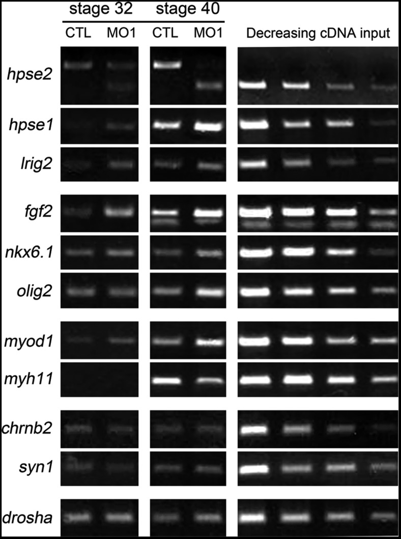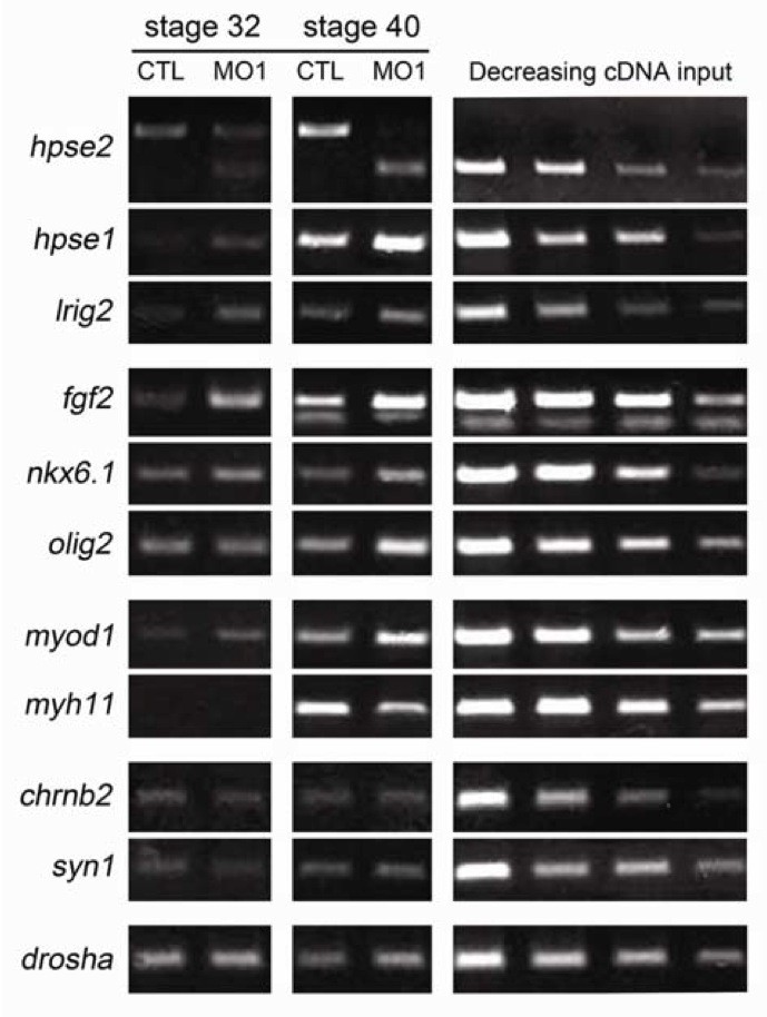 Figure 6. Expression analyses in heparanase 2 knockdown embryos. RNA from pools of stage 32 and 40 control (CTL MO) and morphant (hpse2 MO1) embryos was subjected to RT-PCR, with serial dilutions of cDNA depicted on the right of each row. drosha, which encodes an RNase III enzyme, was used as a housekeeping control. Morphants had: downregulated wild type hpse2 exon 2 and the appearance of the shorter exon 2δ amplicon; increased levels of hpse1 and lrig2; increased levels of fgf2 and of the neuronal precursor markers olig2 (at stage 40) and nkx6.1; upregulated myod1, encoding a skeletal muscle transcription factor, and downregulated myh11, encoding a smooth muscle myosin (at stage 40). Levels of syn1 and chrnb2, encoding synaptic molecules, were similar in morphants and controls.