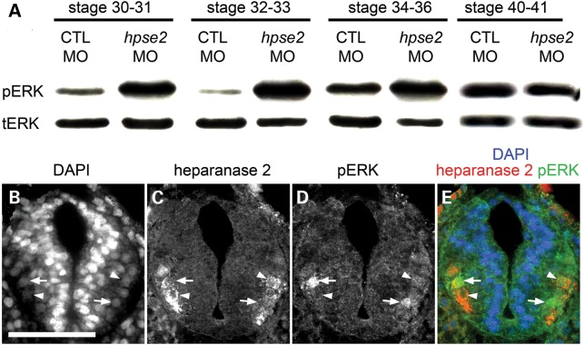 Figure 7. pERK detected by western blotting and IHC. (A) Western blots for pERK and tERK in sets of pooled embryos collected, as indicated, between Stages 30 and 41. Note that the signal for pERK was clearly increased in heparanase 2 knock-down embryos versus CTL MO embryos between Stages 30 and 36. This effect was no longer apparent at Stages 40 and 41 (BâE) Transverse section of the neural tube of Stage 32 uninjected embryo, with the dorsal surface uppermost, showing (B) all nuclei stained with diamindino-2-phenylindole (DAPI), (C) heparanase 2 immunoreactivity, (D) pERK immunoreactivity, and (E) merged image. pERK+ nuclei (two are indicated by arrows) and heparanase 2+ cells (two are indicated by arrowheads) are detected in the lateral zones of the tube. Note that the cells with strong nuclear pERK immunostaining and those with strong heparanase 2 signals tend to be mutually exclusive. The image is representative of experiments on three embryos.