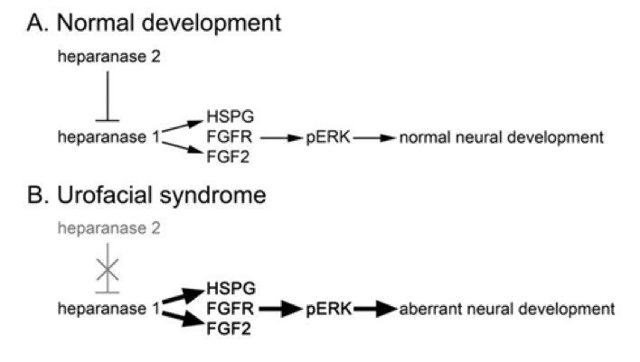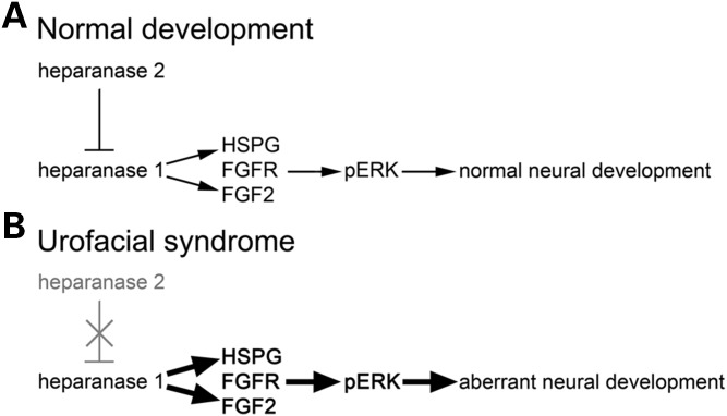 Figure 8. Schematic diagram of proposed heparanase 2 function in FGF signalling and motor neuron development. (A) In normal development, heparanase 2 inhibits the activity of heparanase 1, both biochemically by sequestering HSPGs (17) and possibly transcriptionally (this study). This inhibition maintains normal levels of FGF signalling and downstream genes within the embryo, allowing correct motor neuron functional development. (B) Loss of heparanase 2 causes upregulation of FGF signalling (and subsequent deregulation of downstream pathway components), perturbing expression of genes required for motor neuron development.