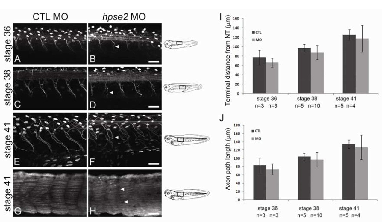 Figure 5. Visualization of motor neurons in parasagittal imaging plane. (A)â(F) whole-mounts immunostained with antibody to acetylated α-tubulin. This labels axons and also multiciliated round organs in the skin, the latter appearing as white ovals. (G) and (H) were probed with the muscle antibody 12/101. (A), (C), (E) and (G) are from CTL MO-administered embryos while (B), (D), (F) and (H) are from MO1-administered embryos. Scale bars are 50 μm. (AâF) Across the top of each frame, a longitudinal section of the neural tube is evident, with the anterior to the left. In morphants, at Stages 36, 38 and 41, neurons which had emanated from the neural tube were regularly spaced but their axons lacked compact bundling and coherent directional extension seen in controls. The irregular topography of certain morphant nerves is indicated by arrowheads in (B), (D) and (F). (G and H) Morphants showed lack of clear separation of skeletal muscle blocks at somitic boundaries (arrowheads in H). (I and J) Nerve lengths (means ± SD), as assessed by determining the shortest distance between where they exited the neural tube and their overt termini (I) or by tracing individual nerves (J). The average length of 4â6 nerves per embryo was used to generate a value for each embryo, with 3â10 embryos in each experimental group, as indicated.