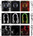 Figure 3. Tissue-specific localisation of heparanase 2. Transverse sections through the trunk of Xenopus embryos, as indicated in the diagrams shown on the right, imaged by immunofluorescence, with the neural tube outlined by blue dashed circles. In merged images, heparanase 2 localisation is indicated in red while other proteins are indicated in green. (A-C) Heparanase 2 colocalised with acetylated
