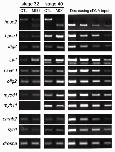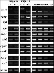 Figure 6. Expression analyses in heparanase 2 knock-down embryos. RNA from pools of Stages 32 and 40 control (CTL MO) and morphant (hpse2 MO1) embryos was subjected to RT-PCR, with serial dilutions of cDNA depicted on the right of each row. drosha, which encodes an RNase III enzyme, was used as a housekeeping control. Morphants had: downregulated wt hpse2 exon 2 and the appearance of the shorter exon 2Πamplicon; increased levels of hpse1 and lrig2; increased levels of fgf2 and of the neuronal precursor markers olig2 (at Stage 40) and nkx6.1; upregulated myod1, encoding a skeletal muscle transcription factor, and downregulated myh11, encoding a smooth muscle myosin (at Stage 40). Levels of syn1 and chrnb2, encoding synaptic molecules, were similar in morphants and controls.