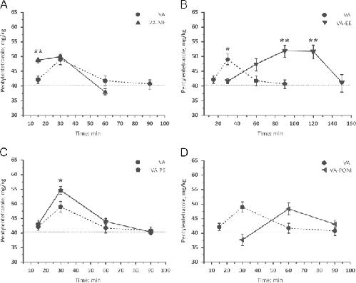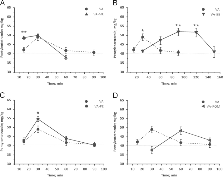 Fig. 5. Changes in seizure threshold upon PTZ-infusion are compared at a dose of 3 mg/kg bodyweight of VA (dotted line) and (A) VA-ME, (B) VA-EE, (C) VA-PE and (D) VA-POM. Each data point represents the mean±S.E.M from at least 3 mice; (â) indicates statistically significant differences with P<0.05; (ââ) indicates statistically significant differences with P<0.01 to VA.