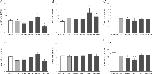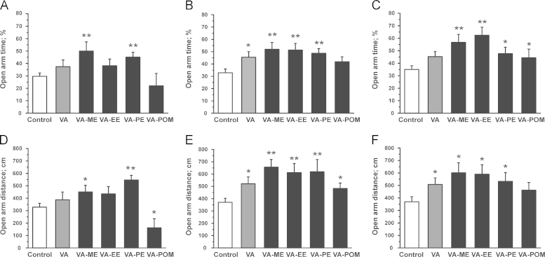 Fig. 3. Effects on explorative behavior of VA-esters in the elevated plus maze test are compared to saline-treated control (white bars) mice at a dose of 3 mg/kg bodyweight. Bars display the time spent (in % of the total time) on the open arms ((A)–(C)) and the open arm distance ((D)–(F)) 15 (left column), 30 (mid column) and 60 (right column) min after i.p. application of the indicated compounds. Each bar represents a mean±S.E.M from at least 8 different mice. (⁎) indicates statistically significant differences with P<0.05, (⁎⁎) with P<0.01 to control.