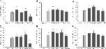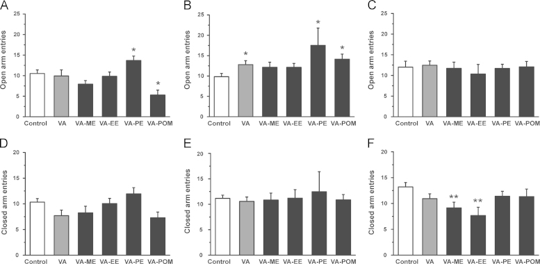 Fig. 4. Number of entries to the open (OA; (A)–(C)) and closed arms (CA; (D)–(F)) of the elevated plus maze 15 (left column), 30 (mid column) and 60 (right column) min after i.p. application of the indicated compound are compared to control (white bars) at a dose of 3 mg/kg bodyweight. Each bar represents a mean±S.E.M from at least 8 different mice. (⁎) indicates statistically significant differences with P<0.05, (⁎⁎) with P<0.01 to control.